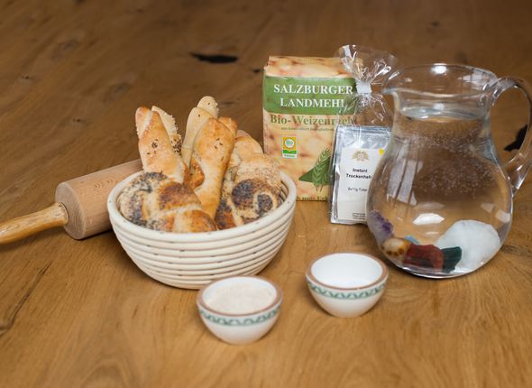 Das Wasser in eine Schüssel geben, Mehl, Salz, Backmalz und die Trockenhefe dazugeben. Zu einem mittelfesten Teig kneten.
