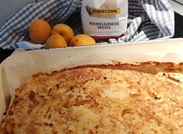 - Die in Scheiben geschnittenen Marillen in eine gebutterten Auflaufform schichten und die Polentamasse darüber verstreichen