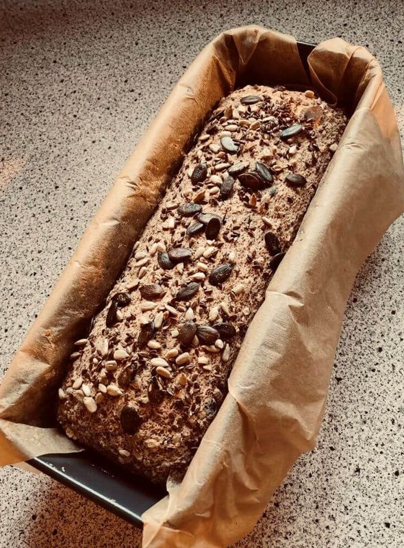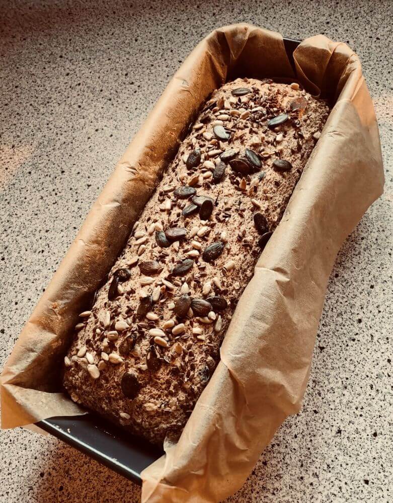 Den Teig in die vorbereitete Backform geben, glatt streichen und nach Bedarf mit Körner bestreuen und ca. 70-75 Minuten goldbraun backen. (Stäbchenprobe machen)