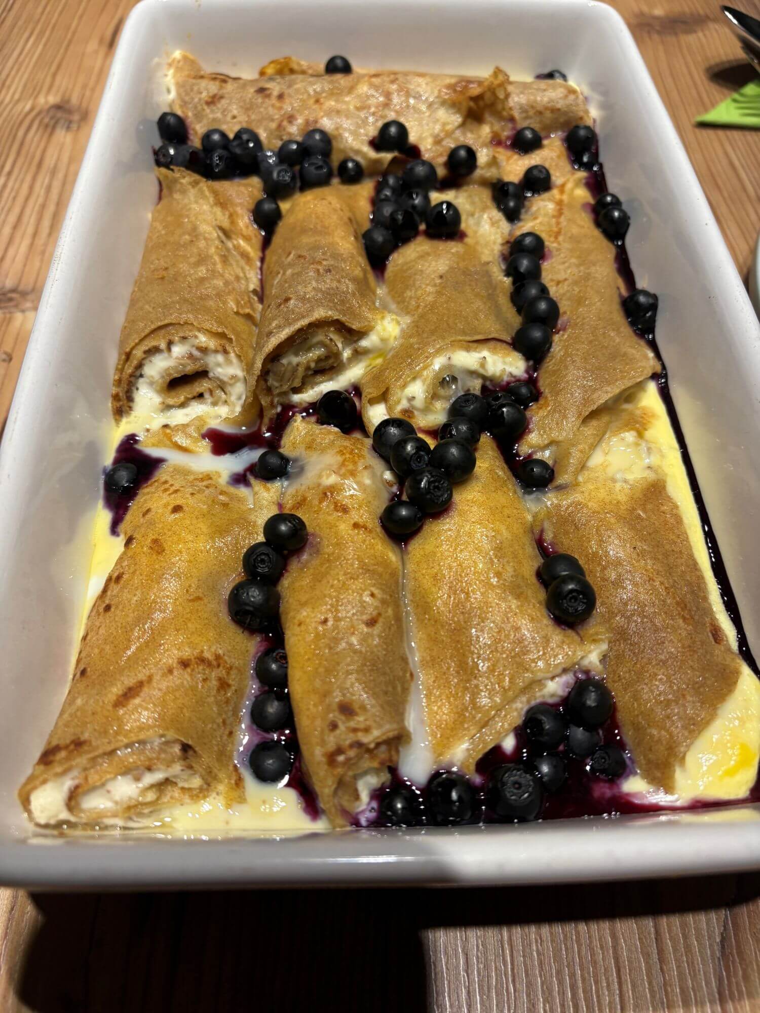 Palatschinken auslegen. Topfen-Nuss-Füllung großzügig darauf verteilen. Einrollen oder falten in eine Form geben und mit einem Milch-Ei-Gemisch (1 Ei & 200g Milch Verquirlen) übergießen.