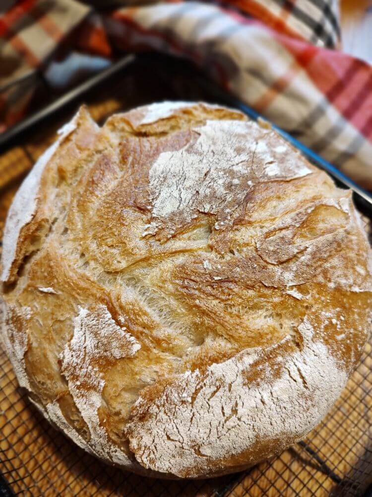 Wenn das Brot die gewünschte Gare erreicht hat, vorsichtig in den heißen Topf kippen und mit geschlossenem Deckel für 30 Minuten bei 230°C backen. Nach 30 Minuten den Deckel abnehmen und für 15 min fertigbacken.